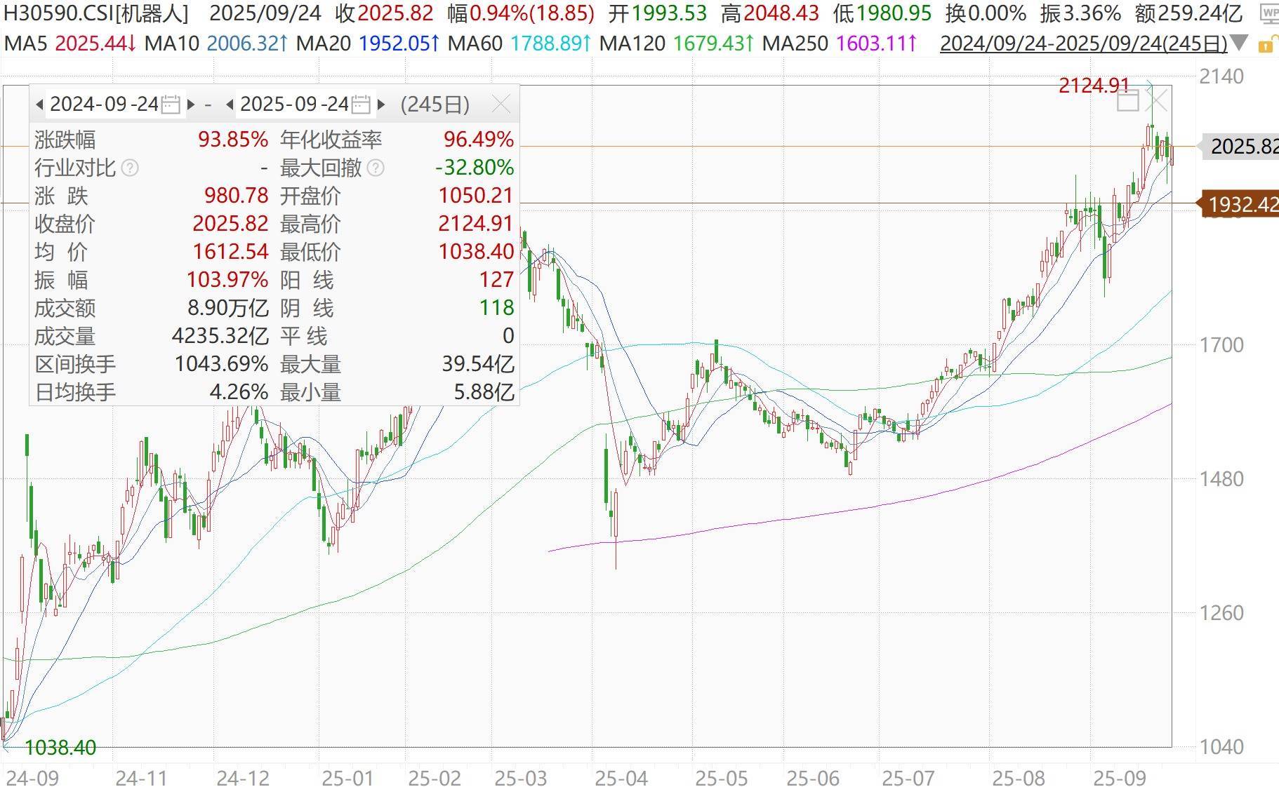自2024年“9.24”行情以来,截至2025年9月24日最新,中证机器人指数的累计涨幅达93.85%,呈现出高弹性、高成长性特征。