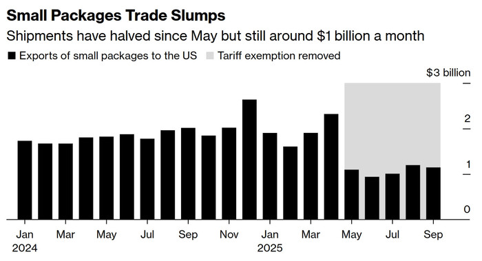 此外,虽然特朗普对输美小包裹“小额豁免”政策磨刀霍霍,但美国消费者仍在通过Shein、Temu等中国境外电商平台购买价值数十亿美元的中国商品。自特朗普政府于5月关闭这一优惠政策后,中方数据显示,小包裹对美出口额仍达到约54亿美元。