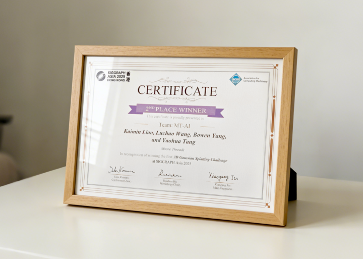 凭借行业领先的3DGS 算法构建能力与软硬件协同优化优势,摩尔线程最终获得二等奖(银牌)的优秀成绩。