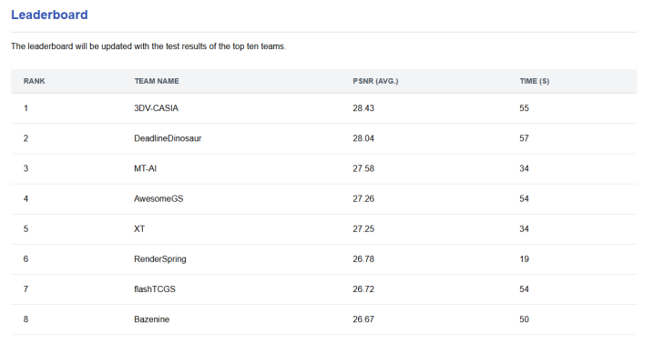 主办方以 PSNR(重建质量)与重建速度为综合评价指标,力求在完全公开、公正的条件下得出权威排名。
